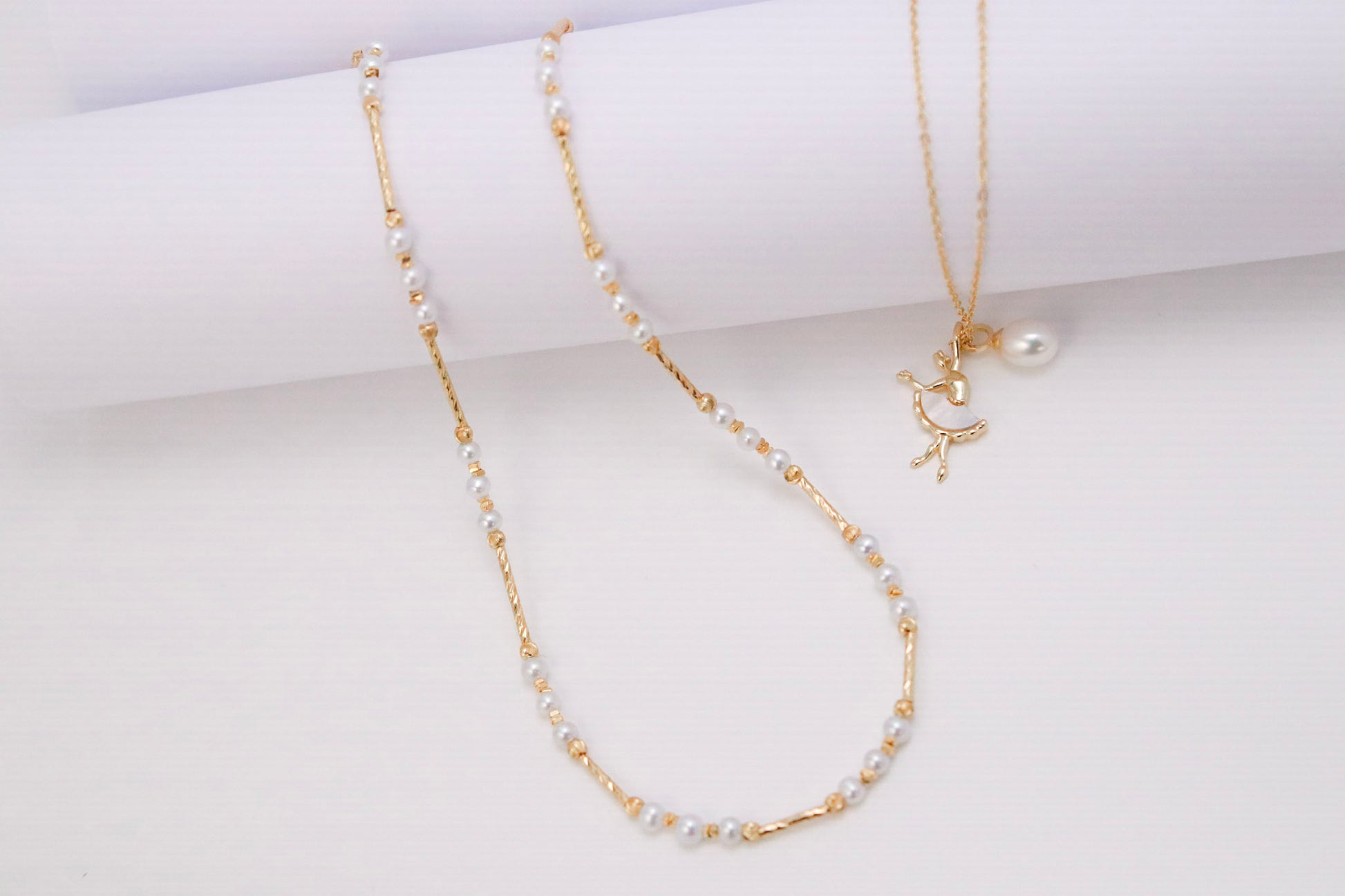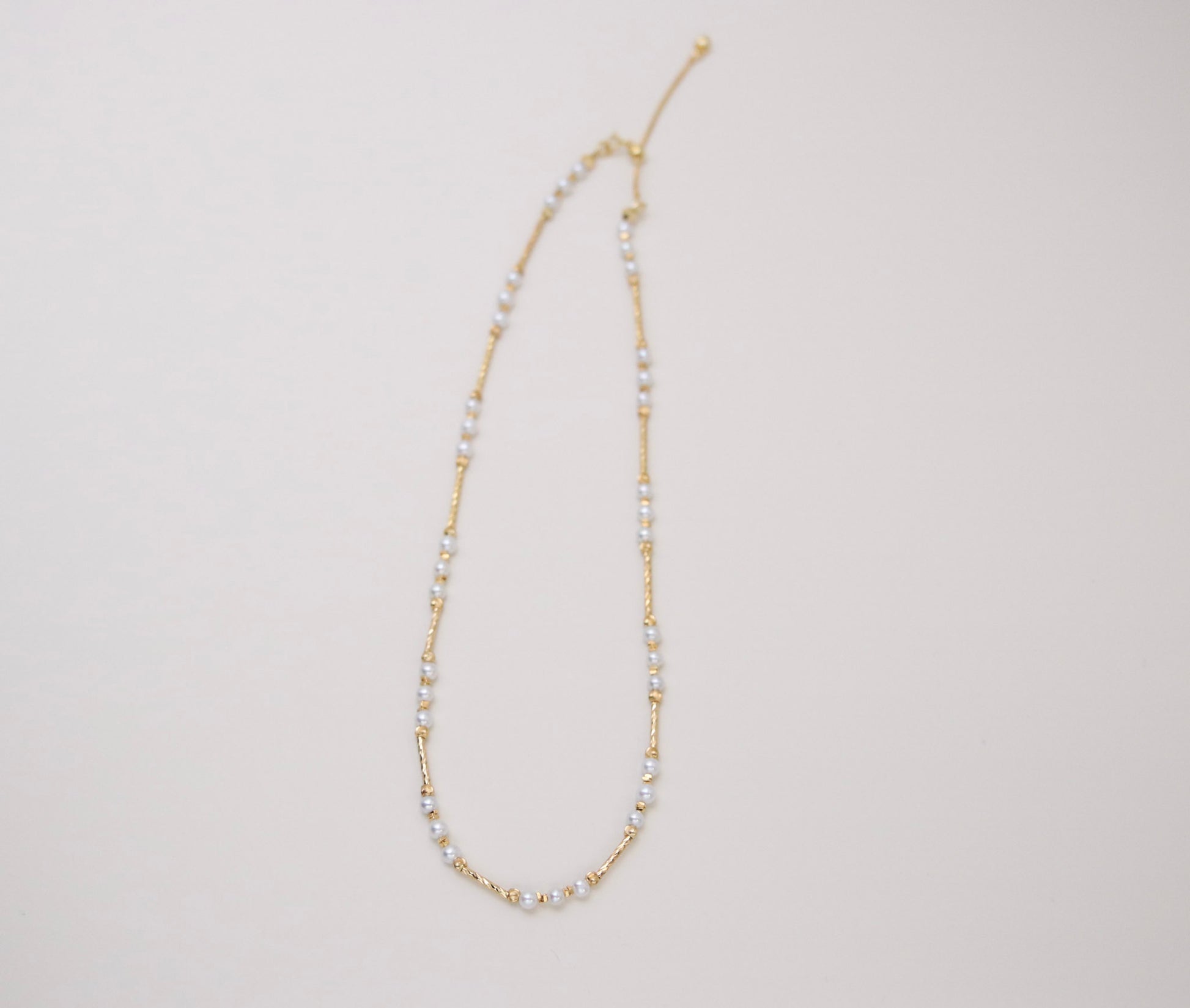 Dieser feine Choker aus schimmernden Süßwasserperlen und zarten vergoldeten Elementen verleiht jedem Look eine subtile Eleganz. Durch sein minimalistisches Design lässt er sich wunderbar mit anderen Ketten kombinieren – ob mit einer längeren Perlenkette oder einer filigranen Goldkette.