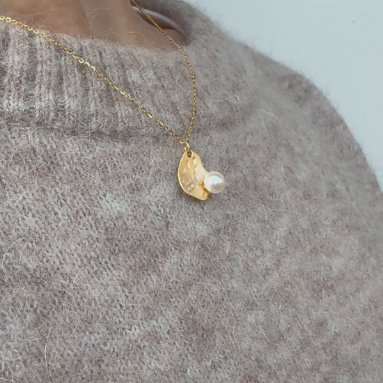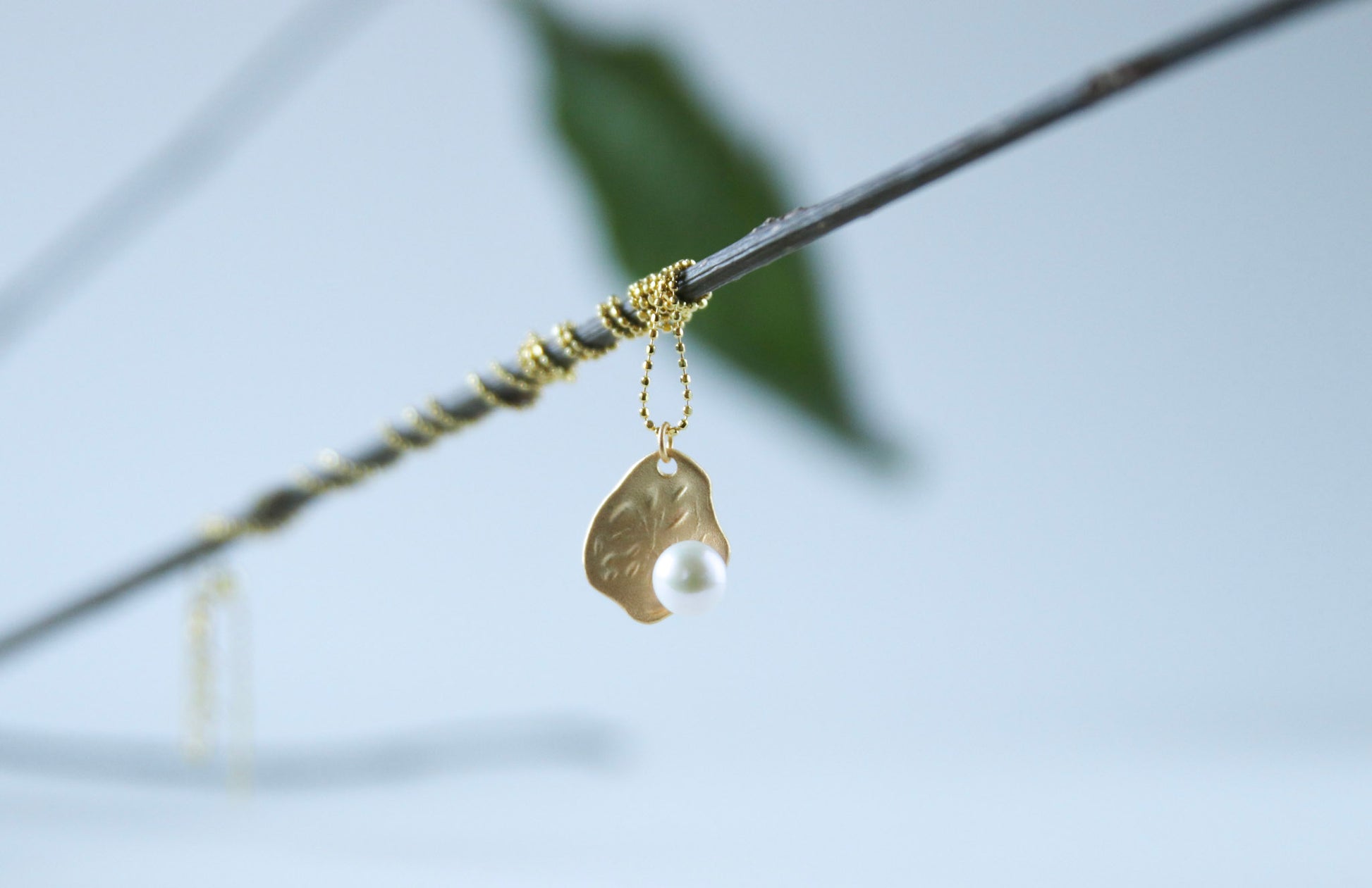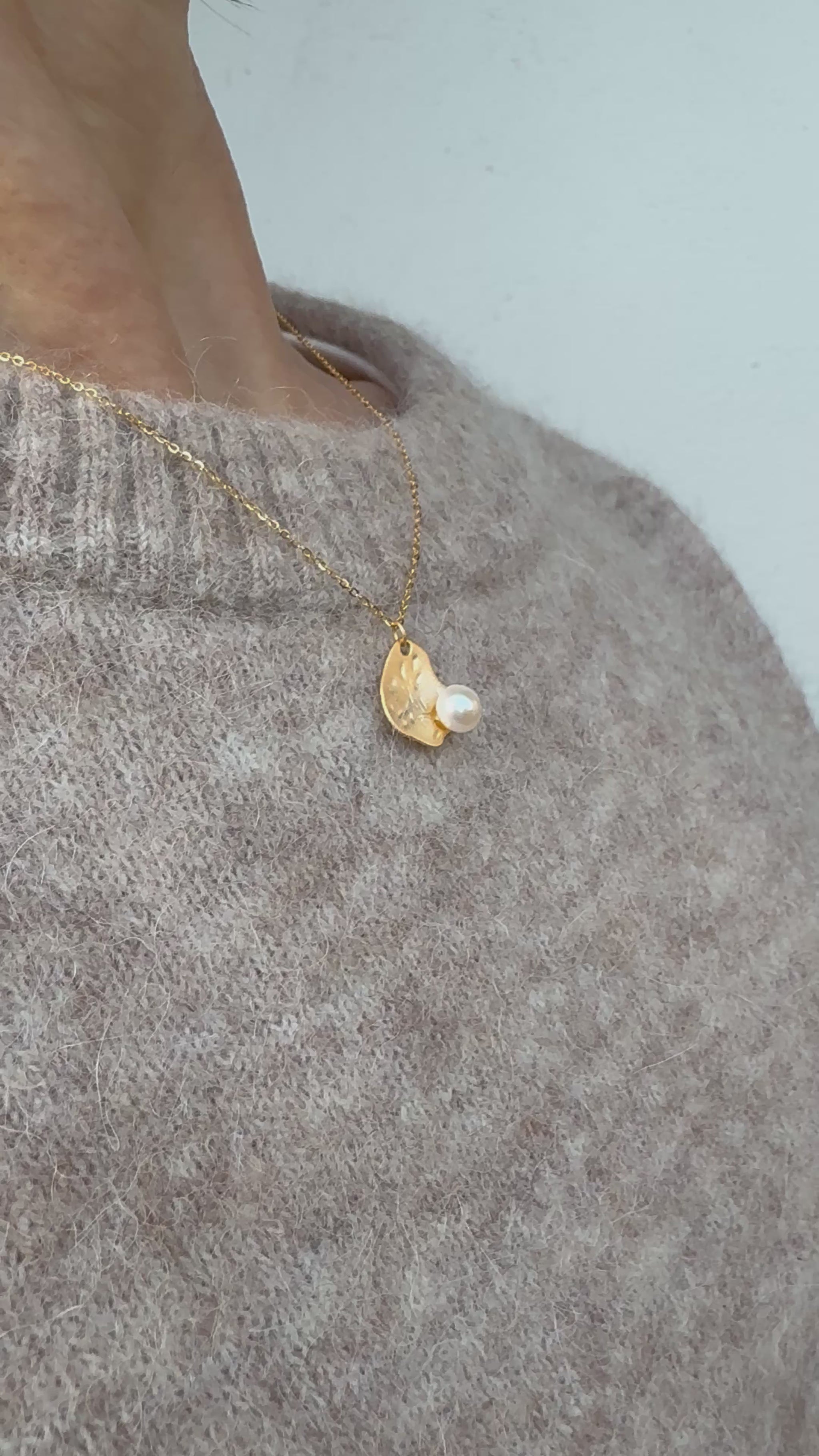 Wie ein Tautropfen auf einem Blatt. Dieser zarte Anhänger zeigt eine kleine, goldene Blattform, auf der eine schimmernde Perle ruht – schlicht und zugleich faszinierend.