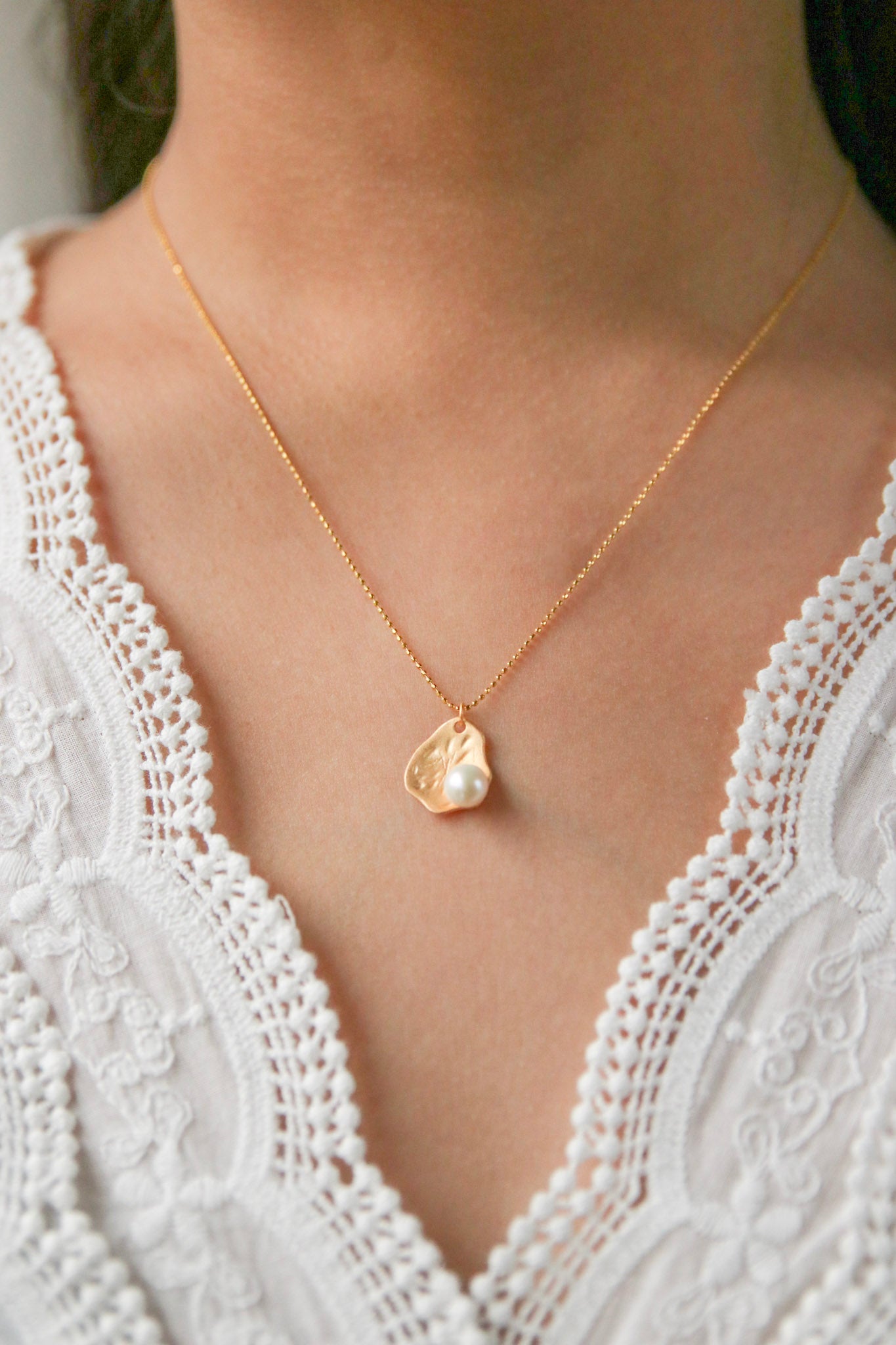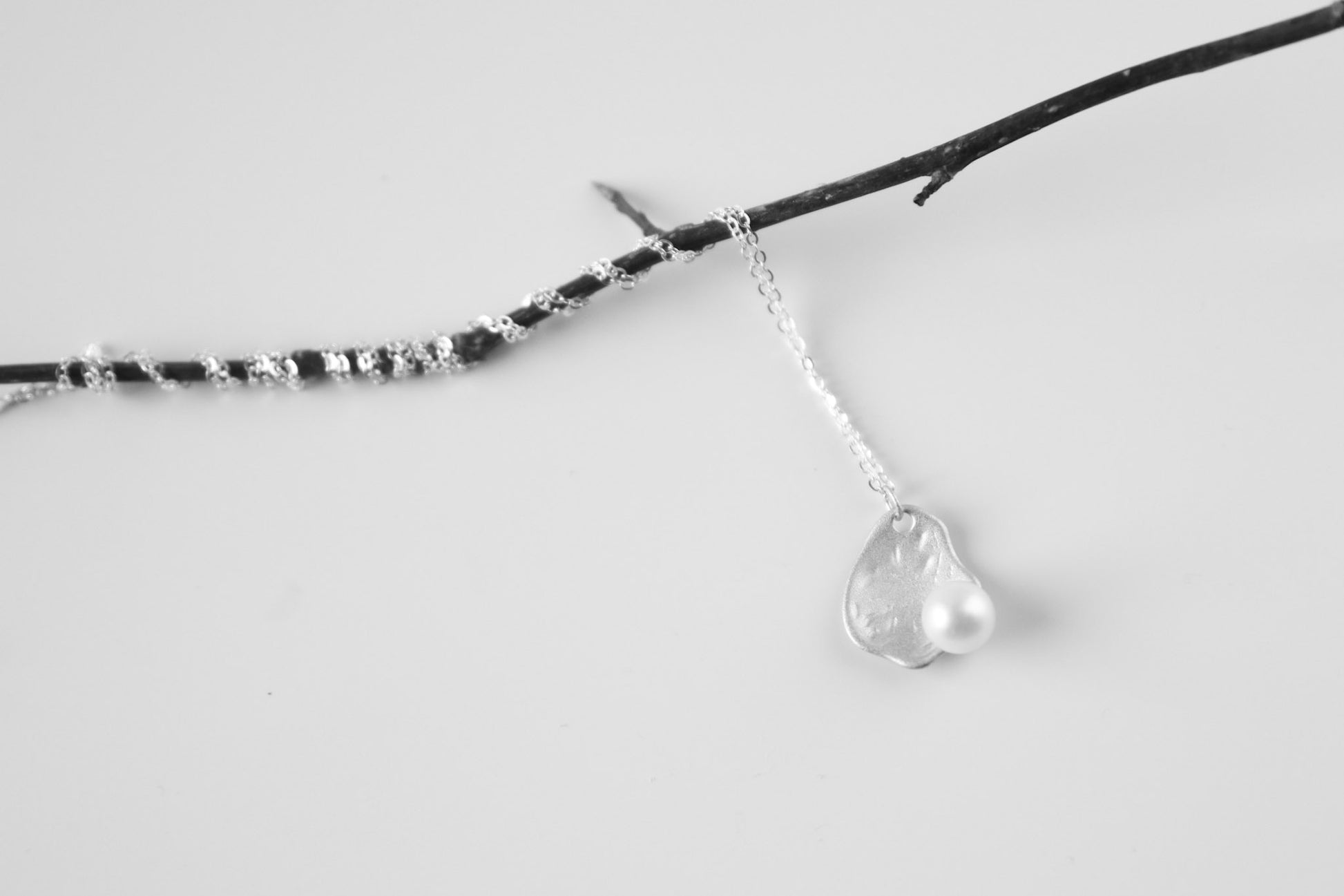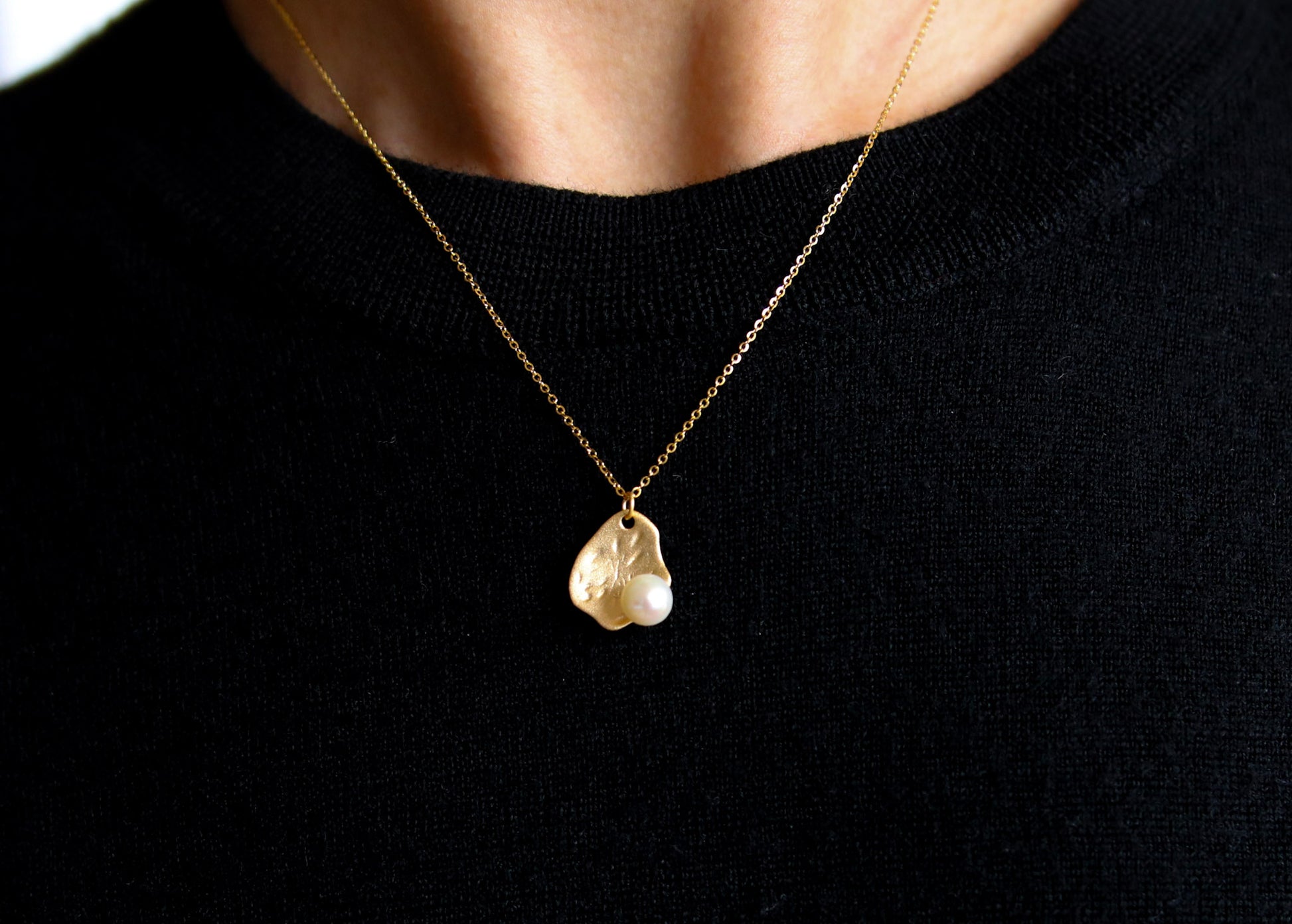 Wie ein Tautropfen auf einem Blatt. Dieser zarte Anhänger zeigt eine kleine, goldene Blattform, auf der eine schimmernde Perle ruht – schlicht und zugleich faszinierend.