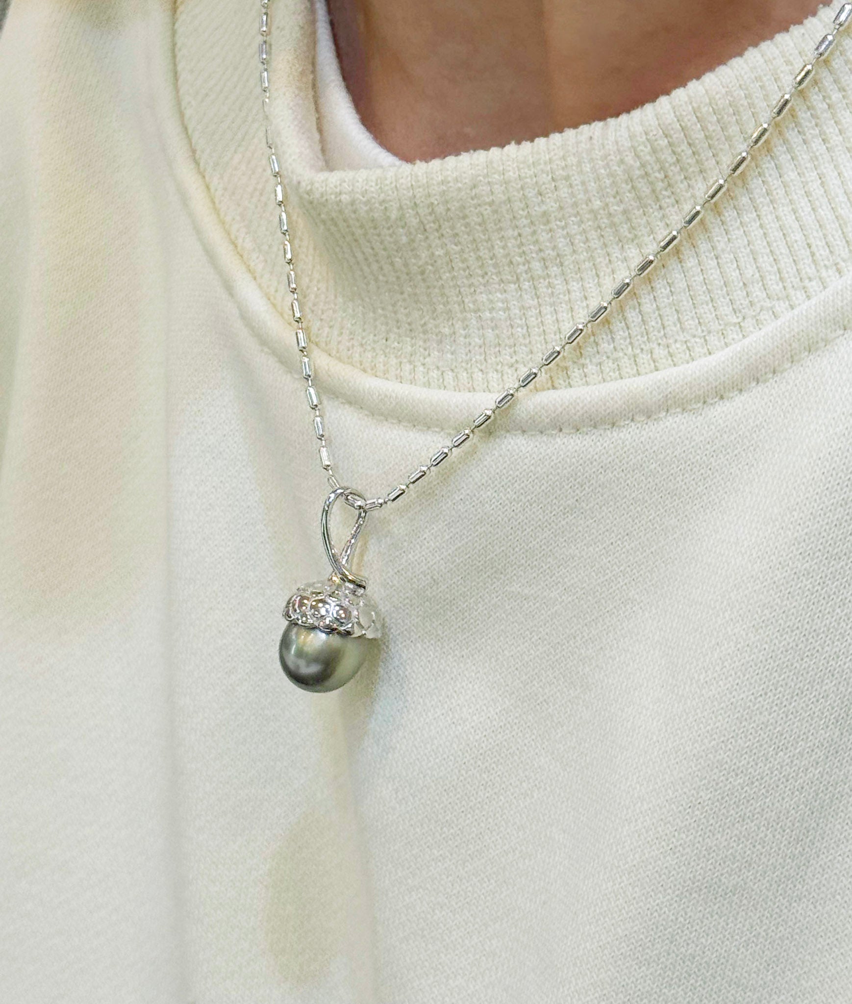 Gefertigt aus einer grünen Tahiti-Meerwasserperle, kombiniert der Anhänger in Form eines kleinen Tannenzapfens mit einer feinen Reiskornkette aus 925er Sterlingsilber. Eine verspielte und charmante Halskette – das perfekte Schmuckstück, um deine Herbst- und Winteroutfits zu ergänzen. Sie passt wunderbar zu deinem Alltagslook ebenso wie zu festlichen Anlässen. Ein einzigartiges Geschenk, das garantiert für leuchtende Augen sorgt. Ein Gescheink für sie und ihn.
